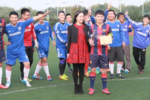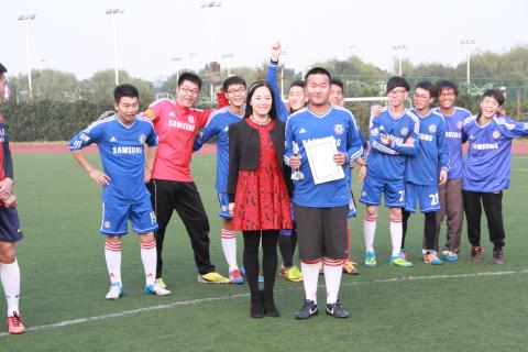 比赛结束后,紧接着就进行了颁奖仪式。本次比赛不仅设立了冠亚季军,还设立了最佳新人,最佳射手等奖项。首先主办方邀请李赛男老师将最佳射手、最佳新人奖分别颁给了环艺系10号球员王辉和视觉系26号球员。接着,环境艺术系易明副书记、视觉系党总支书记吕伟平、工业设计系党总支书记张继玉分别为本系的冠亚季军球队颁奖,并合影留念。至此,苏州工艺美院第十届足球联赛落下帷幕。