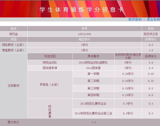 体育部做好二级教学管理,建立了二级督导体系,不断完善督导制度,加大督导力度。在教学改革的过程中,为了便于教务成绩管理,在学院教务处和计算机老师的大力支持下,开发了学生体育成绩管理软件,建立了学生体育锻炼学分登记卡(见表1—4),学生可根据自己的学号随时登入体育部网站,查询自己在每一个阶段、每项比赛后所获得的学分。借助这个管理软件老师不仅可以轻松、快速输入学生成绩,还实现了便捷、规范的成绩管理和学生成绩查询,更重要的是体现了体育课程改革的精华,即通过数据处理方式由人工管理向计算机管理的转变,消除了原考核中课内教学学分和课外活动成绩的壁垒,实现了各类赛事成绩与学分转换,拓宽了学生获得学分的途径和渠道,极大地调动了学生参加体育锻炼的积极性。这是我院体育教学管理在素质育化课程改革中的亮点和创新点。