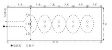 测试场地长20米,宽7米,设标志杆10根(杆高1.2米以上),设置如图1。