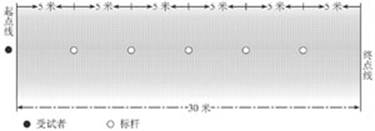 长度40米以上平整场地。测试距离30米,起点至第一杆距为5米,各杆间距5米,共设5根标志杆(杆高1.2米以上),设置如图2。